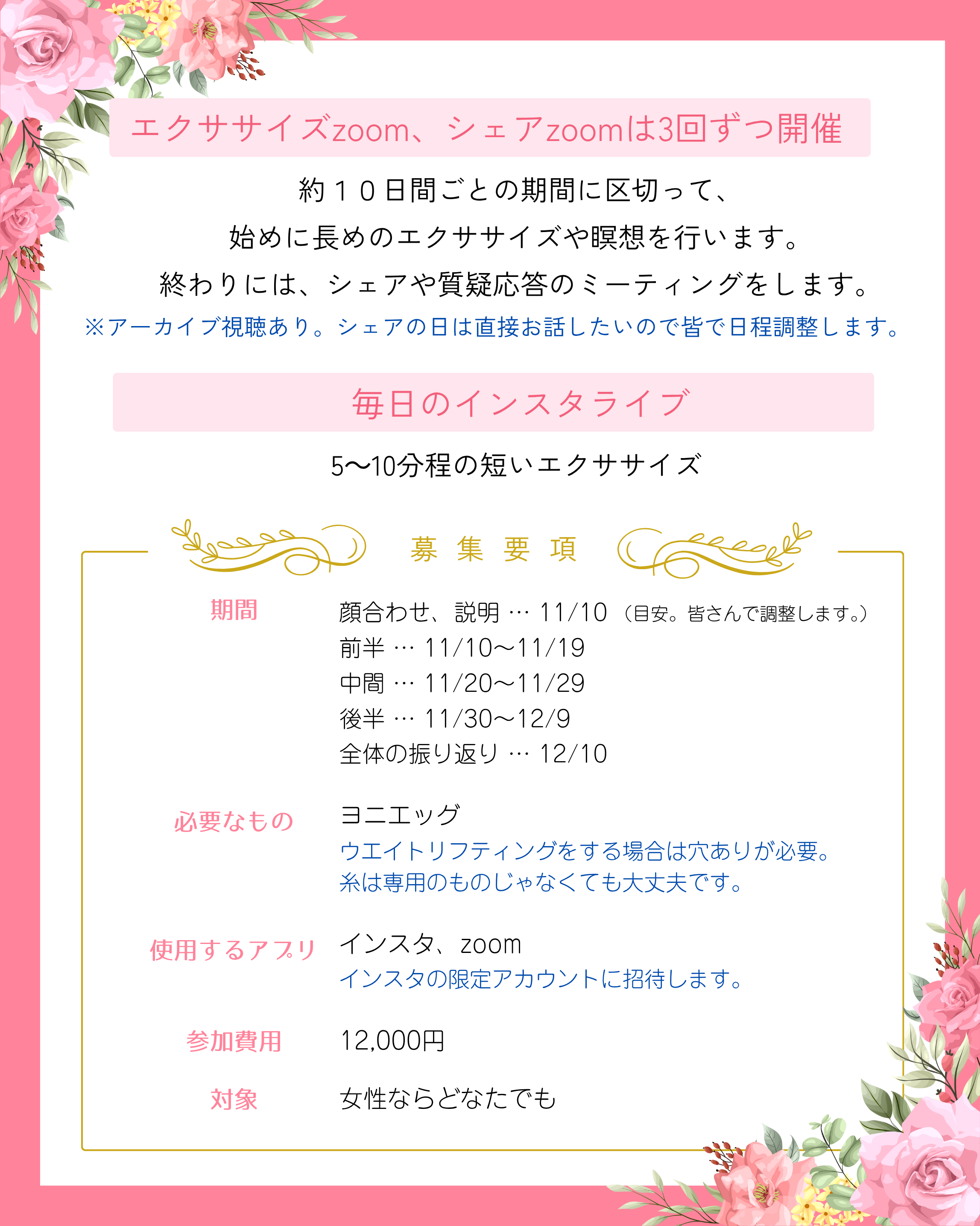 ・10日間ずつの前半、中間、後半に分けて、それぞれの初めにエクササイズのzoomを、終わりにシェアやQ&Aのzoomを各60分程度行います。