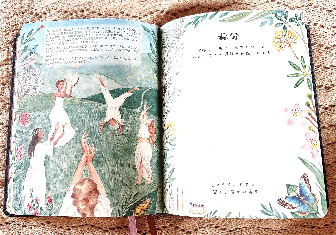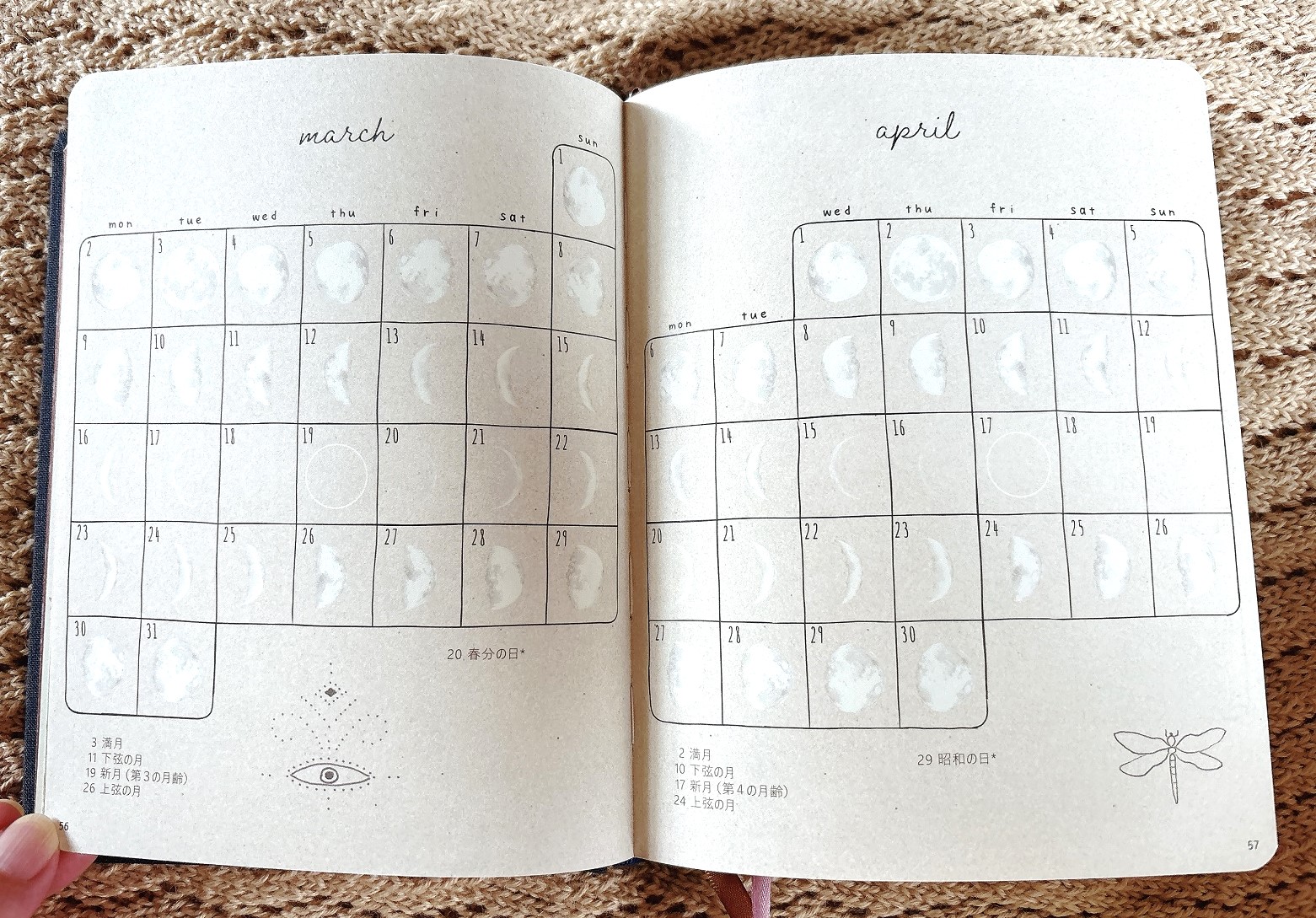 ◎年始の意図のためのページ、各月齢の意図を書くページ、夏至・冬至・春分・秋分の振り返り&意図を書くページ、そして年末に一年を振り返るページ