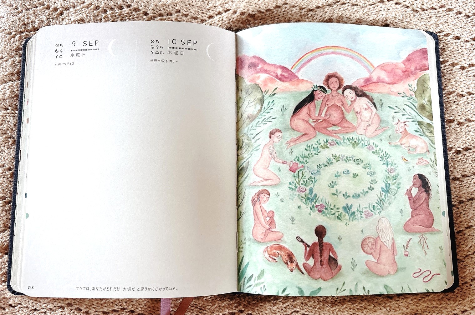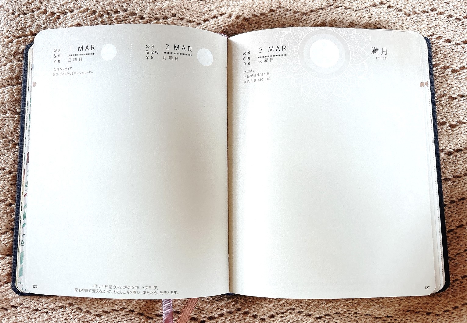 ◎ダイアリーページ(横書き/1ページに2日分、ただし満月は1ページ)、月のフェーズ、女神の日、記念日・祝日、太陽・月・金星のサイン移動などの天文情報